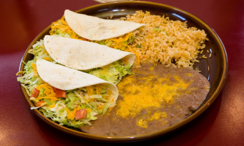 1. Three Tacos Chicken Or Beef Tacos Rice & Beans. $21.95