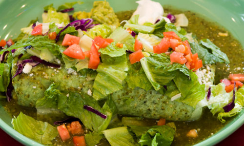 Green Sauce With Romaine Lettuce, Tomatoes & Ranchero Cheese.